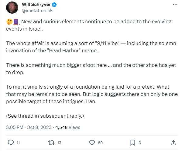 There are many circulating accounts of all the things that seem “off” about Hamas’ attack, so I won’t recount every single point here as most of you have likely read them in multiple places; things like the very implausible breach of Israel’s high tech gates and defenses, to the unprecedented failures of Mossad and Shin Bet, to Netanyahu’s eerily scripted invocation of ‘Pearl Harbor’, which is very telling considering that Pearl Harbor was also a falseflag attack with the purpose of bringing the U.S. into WW2.
