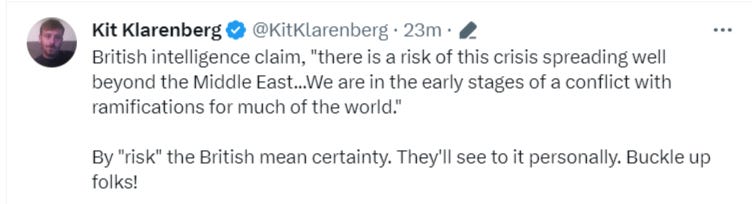 This is not implausible; the neocons may have done their own calculations and gamed it out to conclude that if they don’t take Iran out now, the U.S. is doomed. This could be the beginning of a giant conflagration that would satisfy some of the worst prophecies for 2024. I.e. there being no elections and a new global Black Swan event akin to the last election cycle’s Covid.