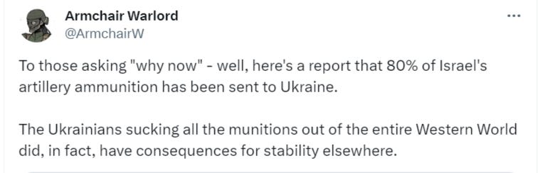 We’re already witness to the media conditioning us for the reality that U.S. will have to use its preciously drained munitions stockpiles for Israel, prioritizing their first beloved over their second newly-christened one. You can easily imagine the consequent excuse in the future: “We had more pressing needs, so we couldn’t fund/supply Ukraine anymore!”