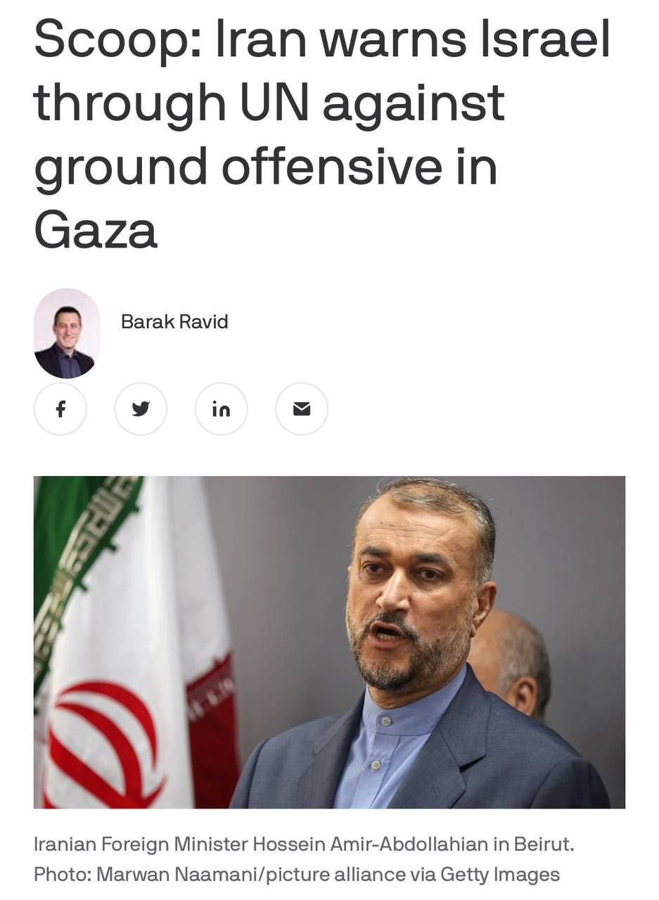 Iran sent a message to Israel on Saturday stressing that it does not want further escalation in the Hamas-Israel war, but that it will have to intervene if the Israeli operation in Gaza continues, two diplomatic sources with knowledge of the situation told Axios.