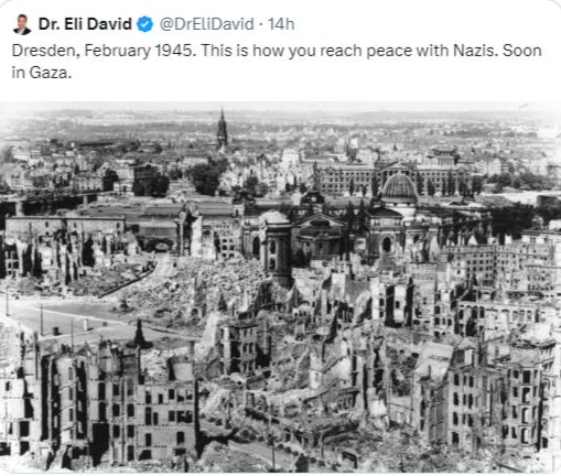 Well my friend after reading the comments I see members of Mossad subscribe to your substack. How some group of human beings can actually believe that some other group is sub human is beyond me. Especially since they themselves went through these horrors 70 years ago . Frankly Israel needs to stop and consider the long term consequences of their behaviour .If they are successful in ethnically cleansing Gaza they will never live in peace with their neighbors .Nor will attacks on Jews ever stop .Dont be fooled by US and European support .Those nations are in financial meltdown and civilisational collapse and soon will be no help in either defending Israel from war crimes investigations or by giving militarily support .There are only 2 possibilities .Either humanity learns to be just to all peoples or we will disappear from the face of the earth