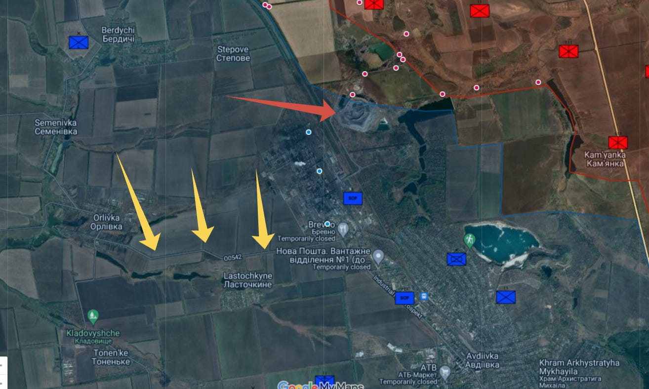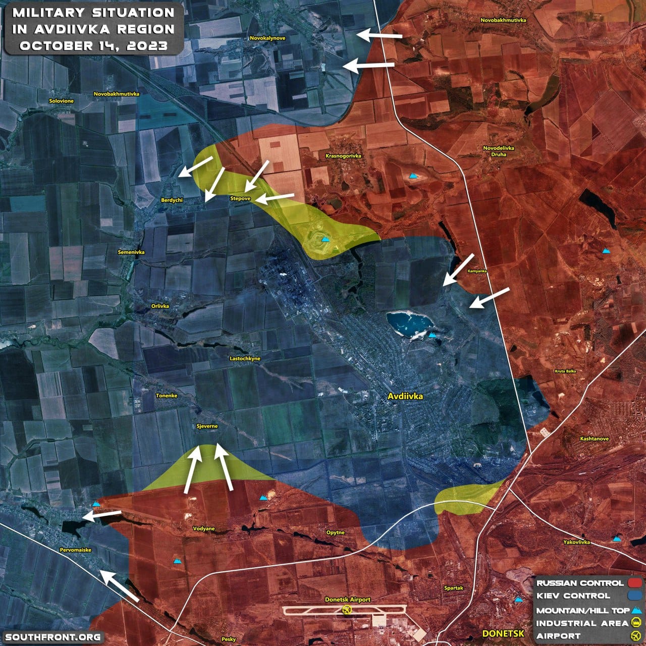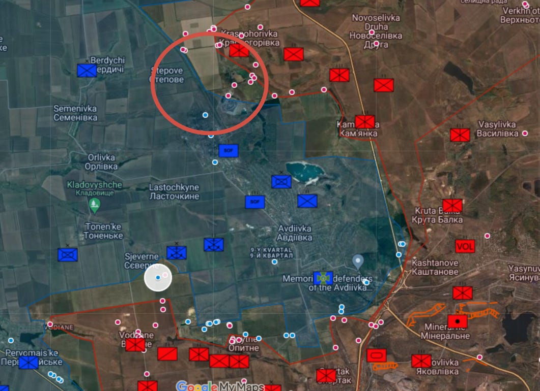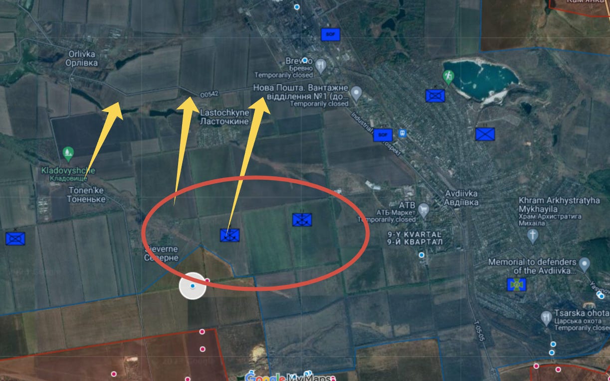 Ukrainian correspondents state that the offensive has as many as 10 axes or vectors. The two most important are those coming from Krasnogorovka toward the slag heap in the north, and that of the direct south. Other vectors include Vodiane, also in the south, as well as Opytne, directly heading toward Avdeevka city itself, seen here: