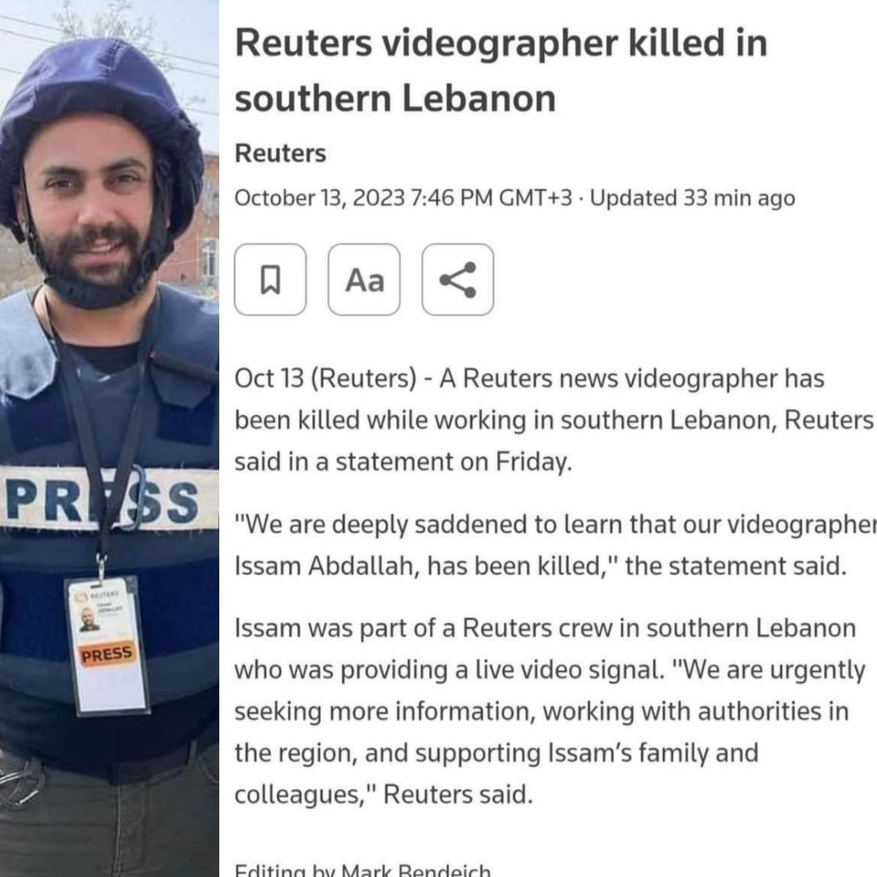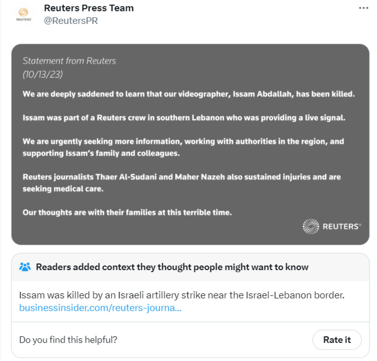 Here the Reuters team is forced to announce the death of their videographer—but readers had to add context via ‘community note’ as to who was responsible for that vague ‘death’: