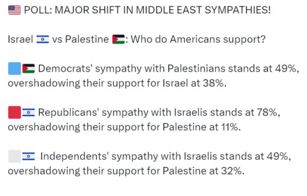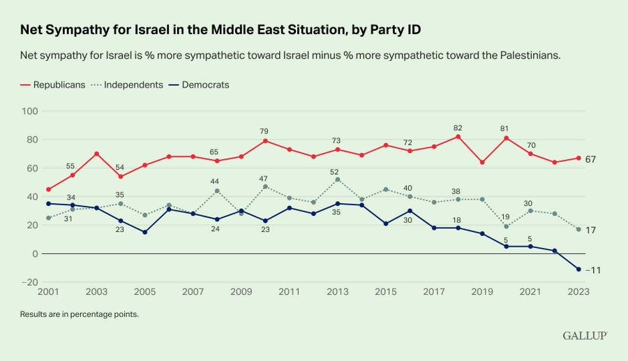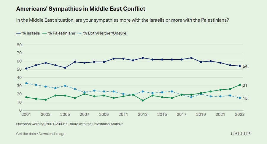 As for overall American sympathies, the majority still supports Israel at 54% with pro-Palestinian sentiment climbing over the past few years: