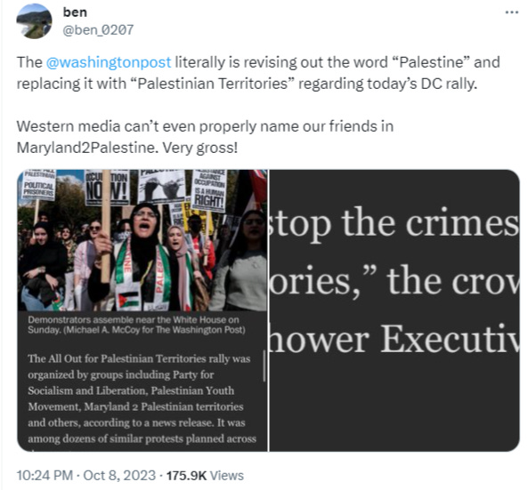 Here, under clear guidance from above, Washington Post is not even permitted to use the word Palestine in its official reporting, and automatically changes it to ‘Palestinian Territories’: