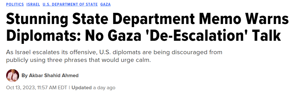 Bloomberg reports that the Biden administration fears Israel has no real plan and the conflict may spiral unpredictably. However, at the same time, MSM has guidance from above that there is to be absolutely no talk of Gaza “de-escalation” by any anchors: