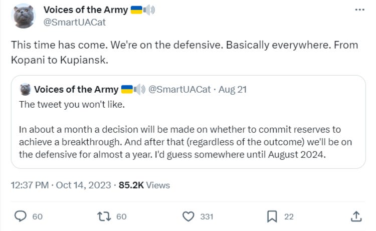The tweet you won't like. In about a month a decision will be made on whether to commit reserves to achieve a breakthrough. And after that (regardless of the outcome) we'll be on the defensive for almost a year. I'd guess somewhere until August 2024.