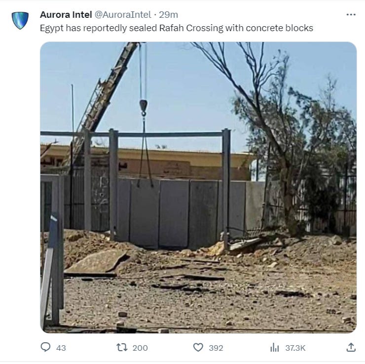 I see a lot of outrage on the pro-Israeli side, calling out Egypt for its refusal to harbor Palestinian refugees as if it’s some kind of “dunk” on Arab nations who refuse to take in Palestinians. But if I were Egypt, I’d do the same thing. They know Israel’s plan is to push the Palestinians out onto them. It’s not so much about the fact that Egypt is unable or unwilling to “take care of” the Palestinians. It’s rather that Egypt knows Israel’s plan and that doing so would vastly strengthen Israel by establishing the full, complete Israeli state after destroying Gaza and the West Bank. So why should Egypt allow their geopolitical opponent, and dare I say enemy, to strengthen themselves in such a way?