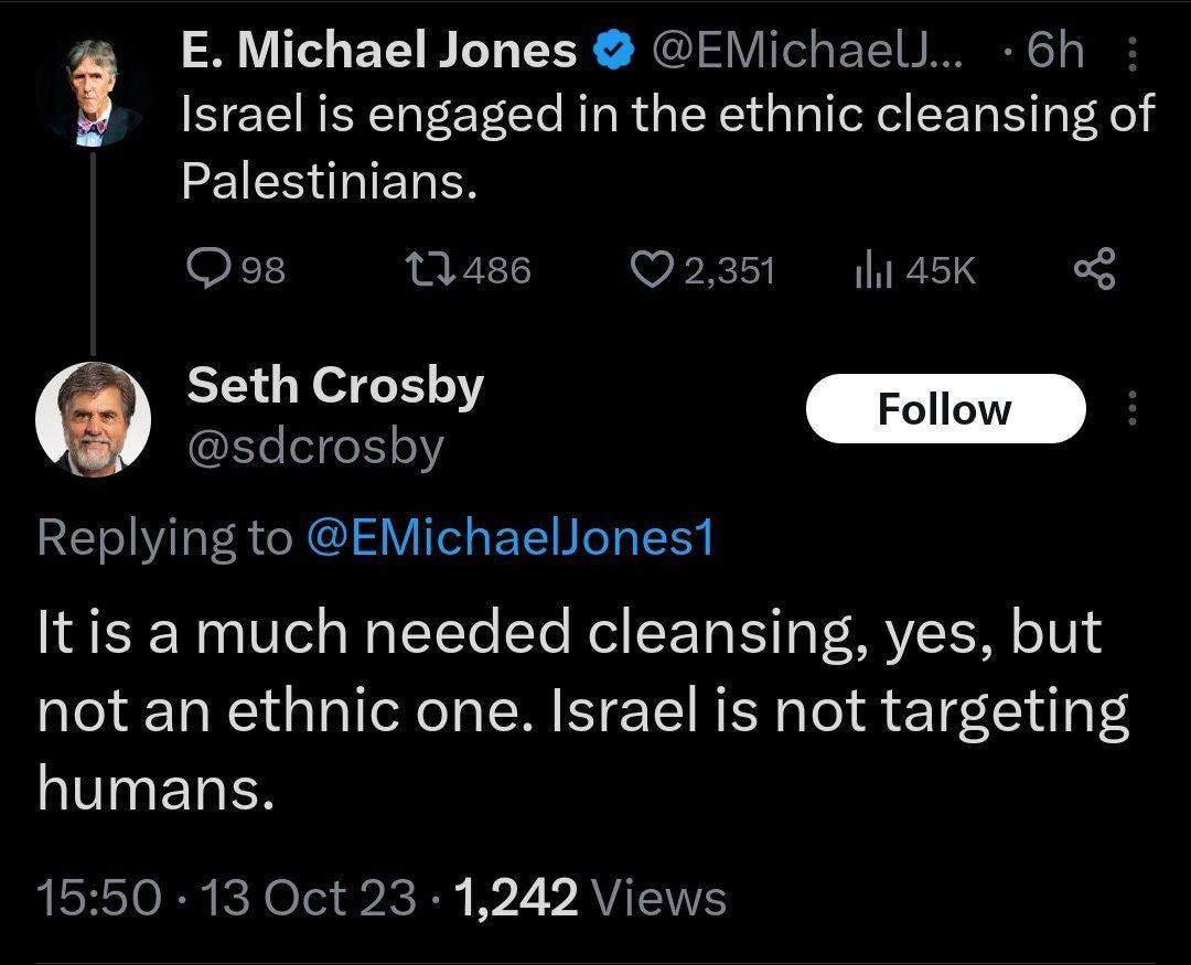 Don’t spew racism, whether it’s aimed at Jews or Palestinians or anyone else. Particularly given the fact that our primary coverage revolves around the Ukrainian conflict, where the Russian people are faced with hideous worldwide Russophobia in the form of actual dehumanized, pre-genocidal-language racism, it should behoove the pro-Russian side particularly to be mindful, as we don’t want it done onto us and so shouldn’t do it onto others.