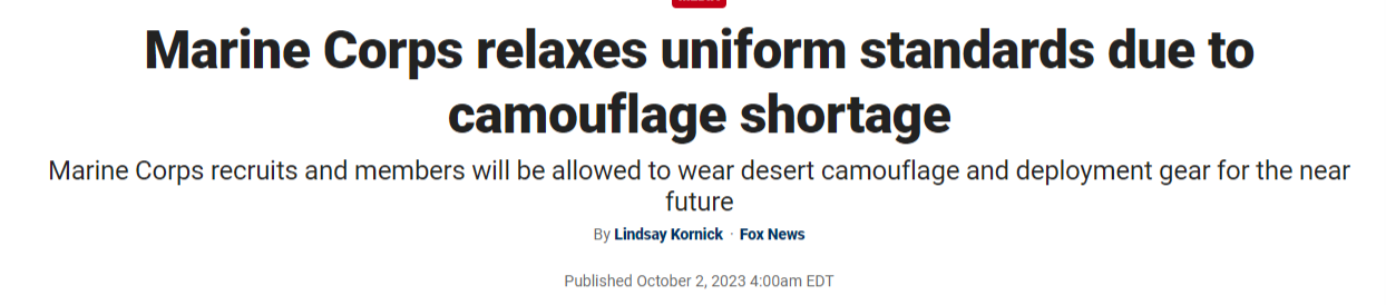 Coincidentally, just days ago a major camo shortage was likewise revealed for the U.S. Marine Corps: