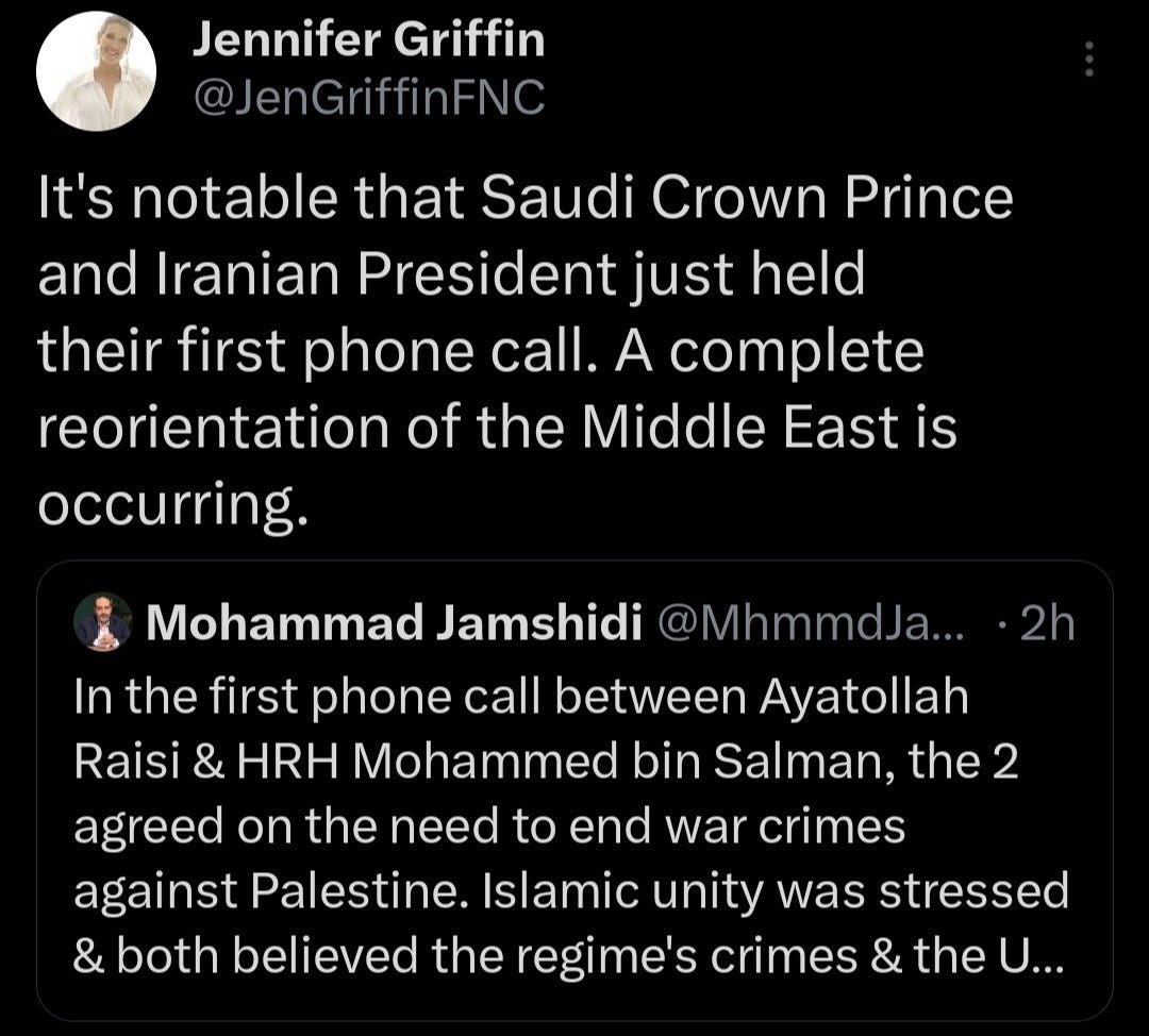 One thing that’s interesting to note is that MSM now reports that Iran did not know about the Hamas attack, and therefore was likely not involved.