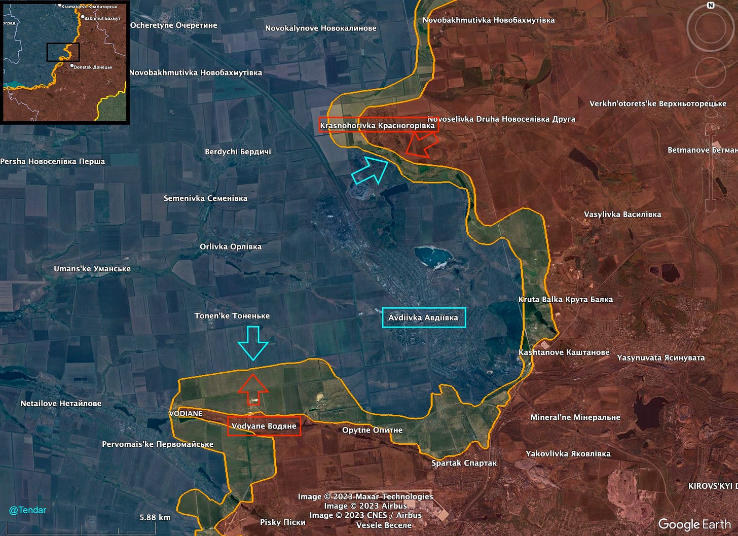 But today’s most notable advances have been made in Avdeevka sector. Unfortunately many sources were premature in announcing big victories like the capture of Berdychi, which turned out not to be true. That typically happens when an advance scout team briefly approaches a settlement, which is subsequently listed as “captured” even though that scout team quickly retreats back.
