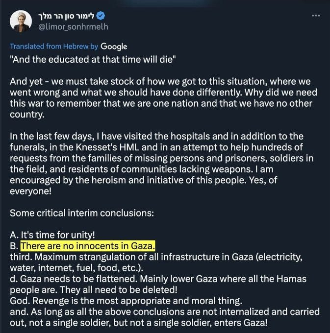 So it appears that “the international community”—or the wonderful ‘rule of law’ people—openly admit that destroying water, electricity, etc., are acts of terror. Thanks for admitting the Israeli regime is a terrorist regime, Ursula. Your words can now be admitted as evidence in the future war crimes tribunals. After all, here’s Knesset member Limor Son Har-Melech openly saying: “There are no innocents in Gaza.”