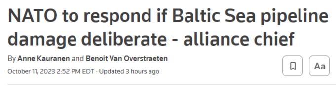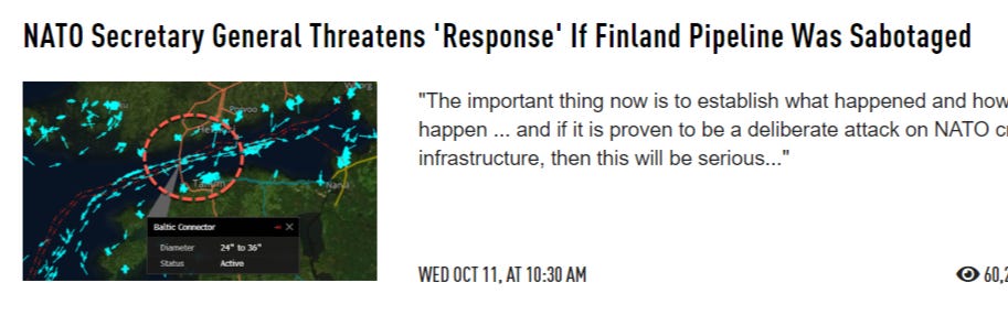 This was exacerbated earlier in the day by a reported gas pipeline explosion between Estonia and Finland, which was promptly blamed on Russia. Naturally, Stoltenberg already “threatened” Russia with a response as well: