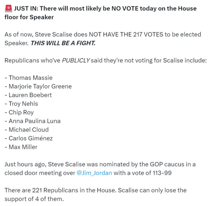 As a last update, it appears now that Scalise has been chosen as the main House Speaker candidate, but tonight has failed to achieve the needed number of Republican votes. They will have to vote again next time after discussions.