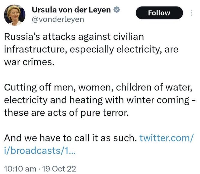 A stark comparison of Ursula von der Leyen’s harsh words aimed at Russia vis a vis the Ukrainian conflict: