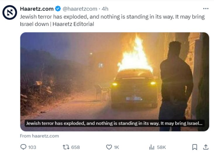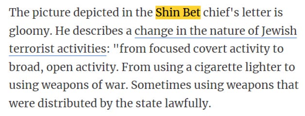 Haaretz also reports of a letter sent by Shin Bet chief Ronen Bar to Netanyahu and Minister of Defense Gallant stating that “Jewish terror” is now threatening the very existence of the state of Israel.