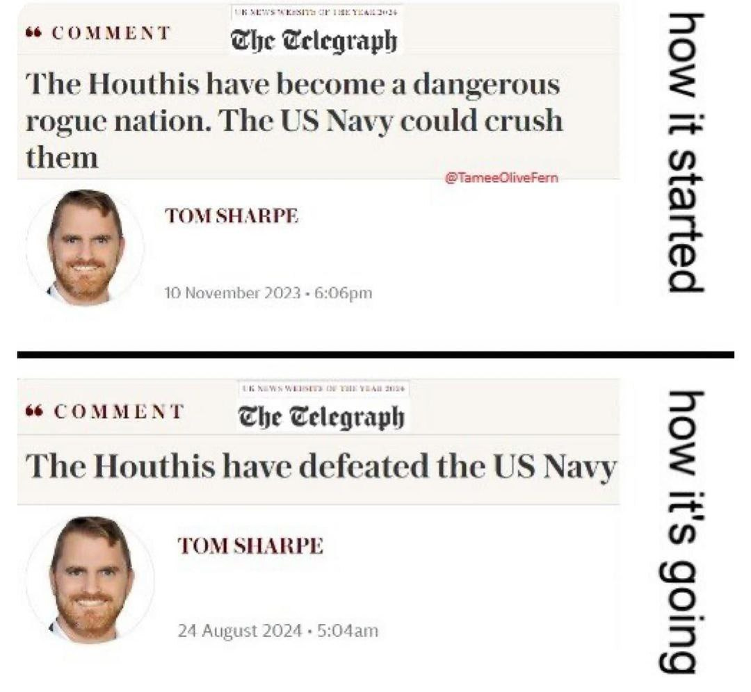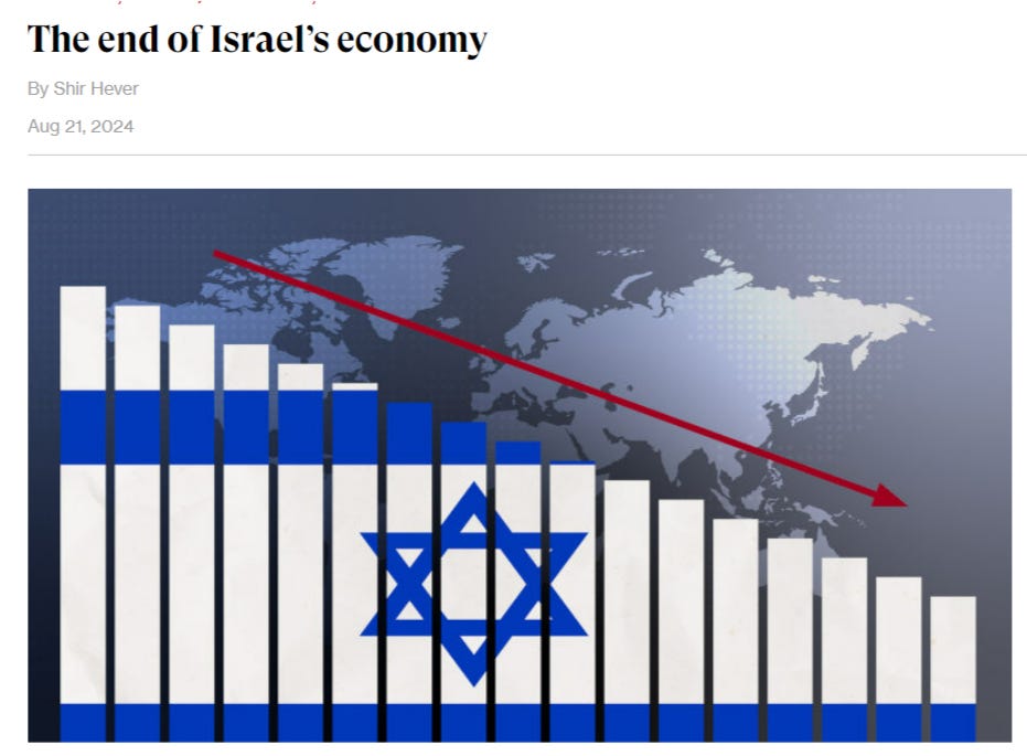 Additionally, people consider Iran’s lack of reaction to the assassination of Haniyeh on their territory as weakness or cowardice. I have expressed that I think it’s a smart move—Iran sees that Israel is slowly choking from the pressure. Hundreds of thousands of essential Israeli farmers and citizens from the north have fled, many of them stating openly they will never return. Israel’s economy is in freefall, with its only port on the Red Sea, Eilat, having been in complete shut down for months with the port operator announcing the lay off of most of the workers.