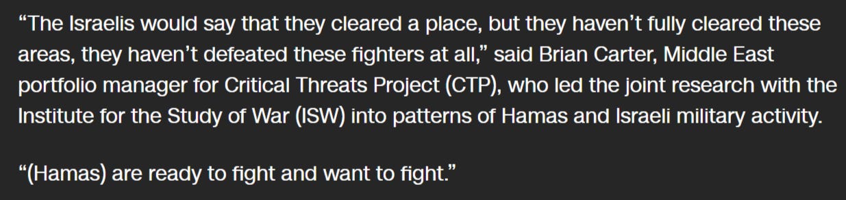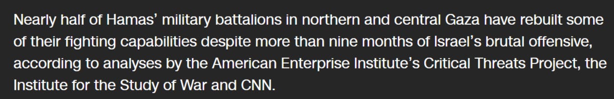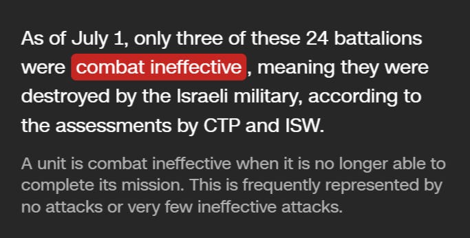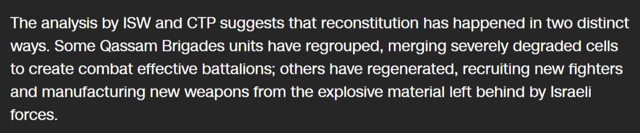 They do go on to clarify that 8 of the 24 battalions are considered fully “combat effective”, while the remaining 13 have been somewhat degraded but continue to function in a more sporadic, guerilla style. But they admit that Hamas is actively working on reconstituting all of the degraded battalions.