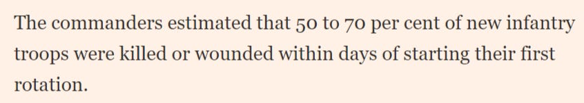 The commanders estimated that 50 to 70 per cent of new infantry troops were killed or wounded within days of starting their first rotation.