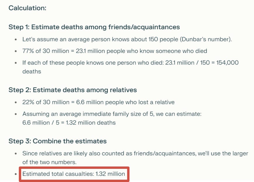 Using Dunbar’s number and other calculus, the AI reached an estimate that the above figures for a country of 30m would represent about 1.32 million total casualties: