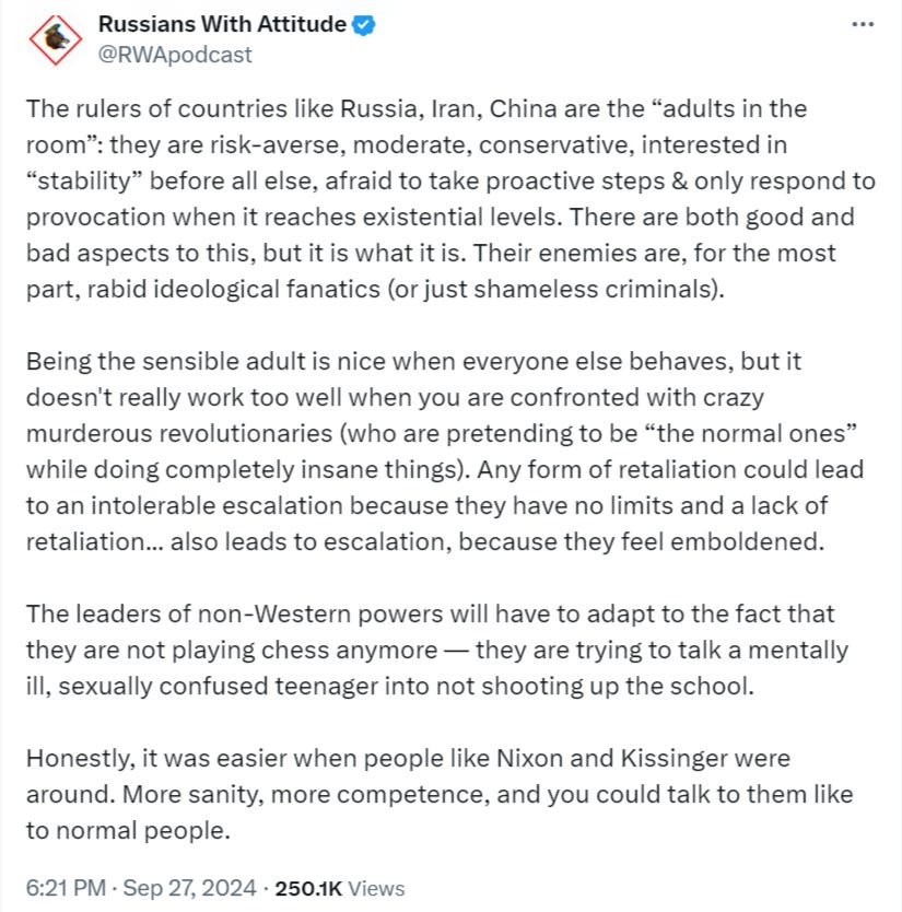 One thing that’s true is that the resistance sphere has been classically led by a stodgy old, inflexible gerontocracy. Figures like Nasrallah, or Iran’s Khamenei—who’s almost 90 years old—along with much of Russia’s MoD at the start of the war. Compare to Israel’s younger, cunning state department, general staff, etc.