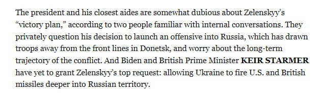 ▪️ “They privately question his decision to launch an offensive in Russia, which diverted troops from the front line in the Donetsk region, and express concern about the long-term trajectory of the conflict,” the publication writes, citing sources.