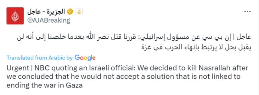 This might sound like nothing but this is one of the most extraordinary revealing things Israel has said. In the words of Israeli officials themselves Nasrallah literally died because he refused a side deal that abandoned the Palestinians. In effect this man labelled "terrorist" died because he refused to yield on what all UN resolutions and the immense majority of the international community have been calling for ceaselessly. Except he, unlike those others, had teeth. So, unlike what so many people are saying, the real reason for his death isn't because "Hezbollah are terrorists and they're bad" but so Israel can pursue its land grab and ethnic cleansing unimpeded. He was one of the only ones actually willing to make them face accountability for it and, in their own words, that's why he had to die.