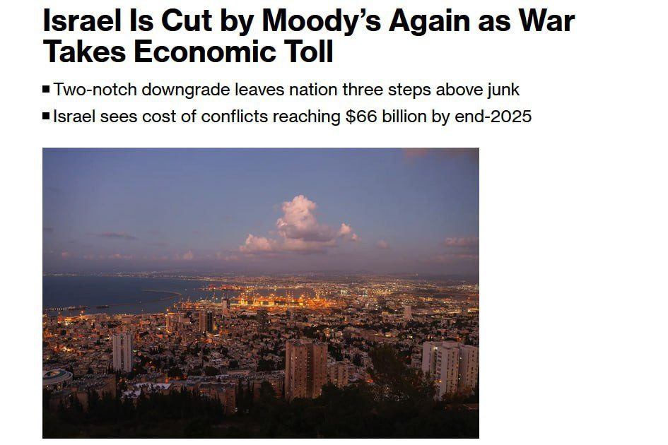 ❗️ Israel's rating has been downgraded for the 2nd time this year: in February, from A1 to A2 due to a reduction in the country's GDP by 20%. And by the end of next year, the costs that military conflicts will entail will amount to another 12% of GDP, according to Israeli officials. However, the Israeli Finance Ministry believes that the country is doing well financially.