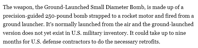 However, apparently the U.S. military itself doesn’t even yet operate the GLSDB. They’ve tested them in the past, but they don’t have any current operational systems in service. And according to various sources, the Ukrainian HIMARs are therefore likewise not compatible with them and would take ‘up to 9 months’ to get them retrofitted.