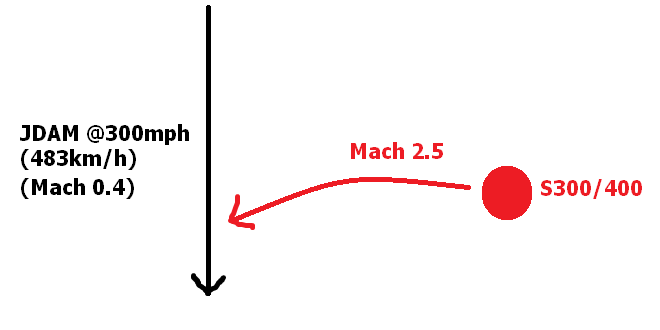If the JDAM (or GLSDB for that matter) is flying in the same parallel vector, but it’s only going a small fraction of Mach 1—which is what the bombs will slow down to—you can see that even if the plotted vector is distantly parallel to the S300/400 unit, the missile traveling at Mach 2.5 which is several times faster, will be able to ‘catch up’ with the target.