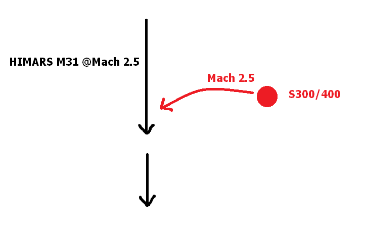 The S300/400 missile also traveling at Mach 2.5 will have a very hard time ‘catching up’ with the HIMARS one, unless it were flying ‘directly over’ the S300/400 unit, or fairly adjacently close.