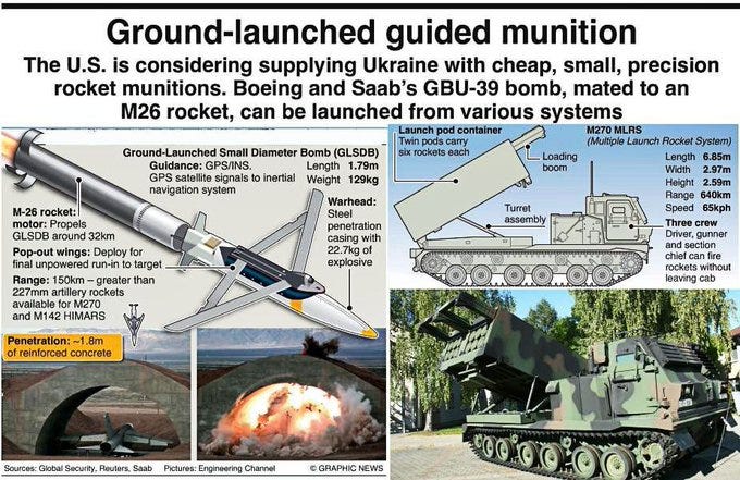 Thus, its interception vulnerability is still fairly high BUT, the difference is that Ukraine would theoretically have much greater ‘saturation’ potential with this. As mentioned earlier, with ~20 HIMARS/M270 vehicles which can launch 6 each (M270 can do 12), there is far greater ability to saturate, making this weapon far more potentially deadly than the JDAM.