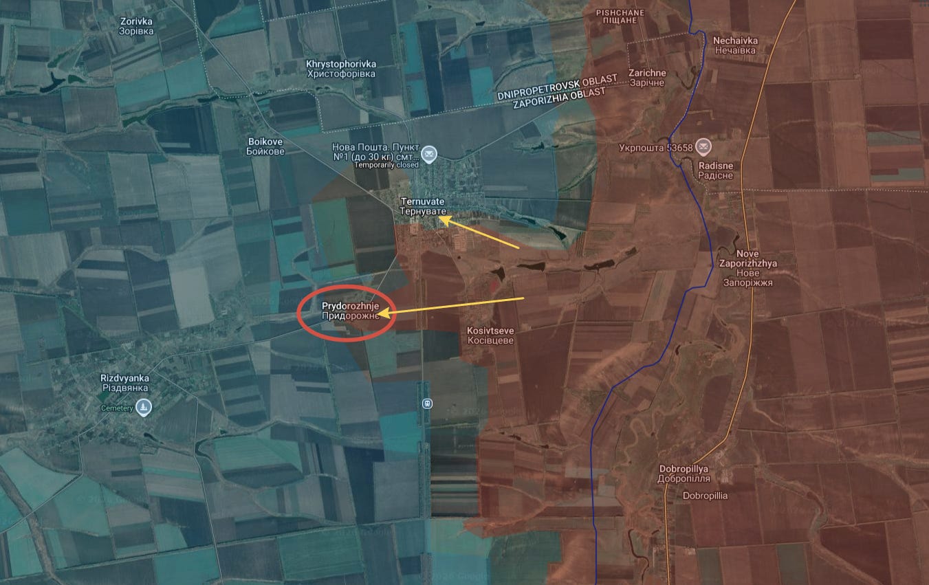 Likewise, just north of there last time Russian forces had captured most of Ternuvate. Now they have captured adjacent Prydorozhne, though some mappers—as can be seen below—don’t yet have all of Ternuvate taken as of yet: