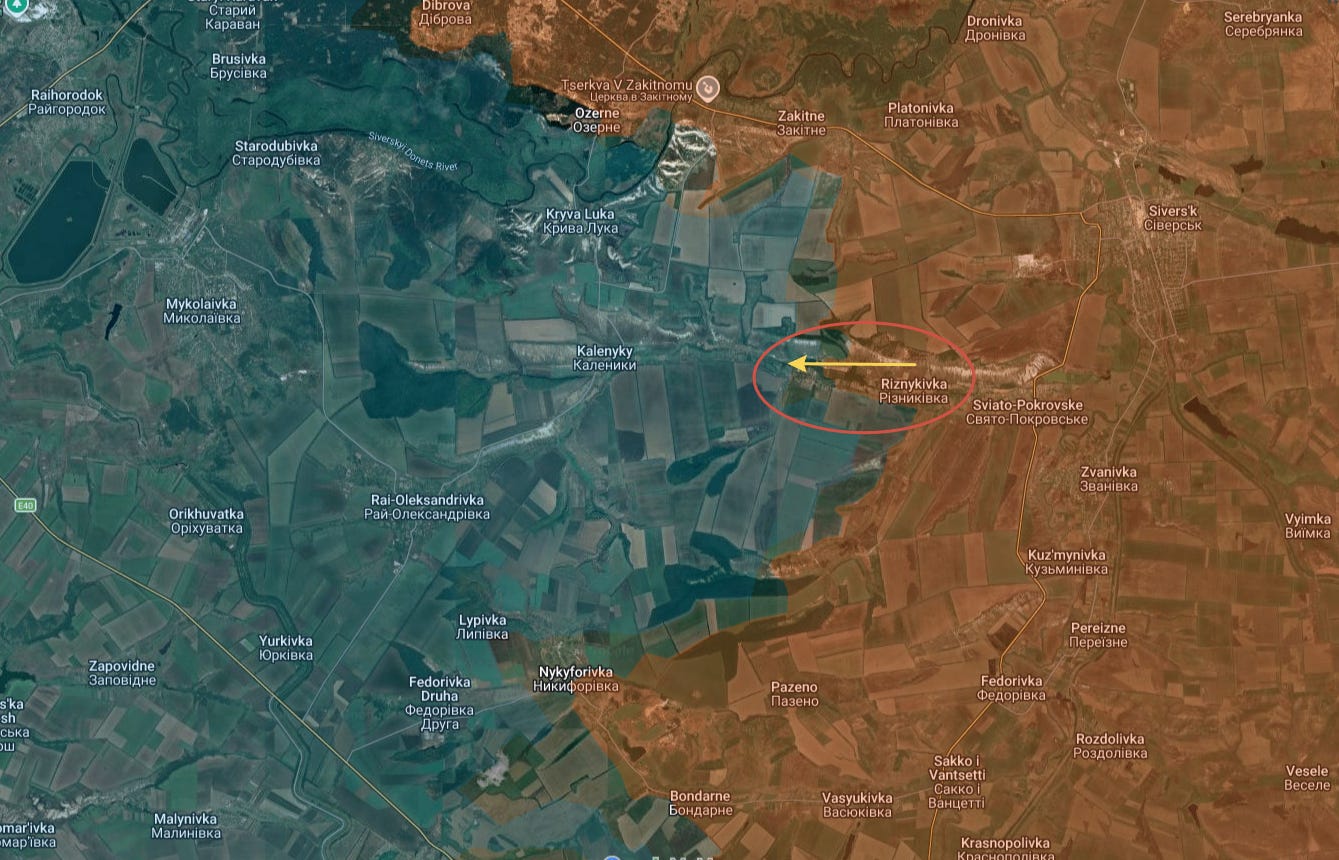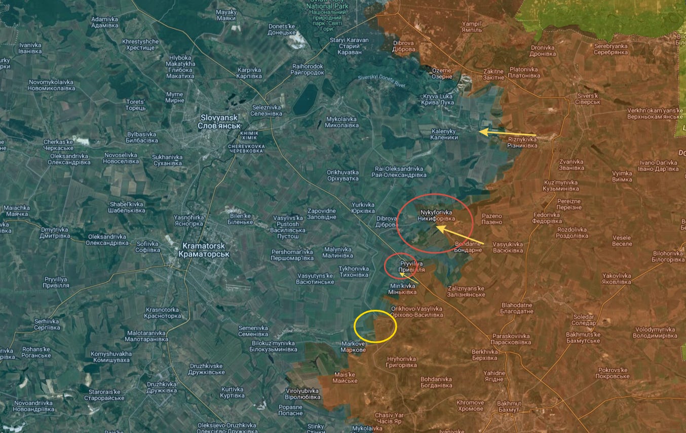 On the Seversk line, Russian forces are pushing the entire wall westward toward Slavyansk. The circled areas saw advances westward—in particular the area between Nykyforovka and Pryvillya below—with the yellow circle showing Novomarkove which was taken a week or two ago: