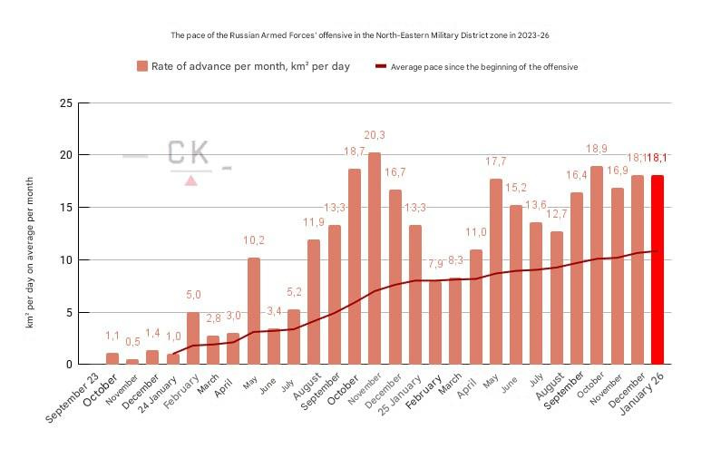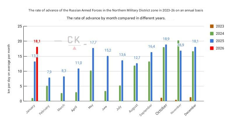 As a note—recall that on the first graph, the statistics for late 2024 are heavily skewed by Russia’s retaking of the Kursk region, which took place from about August 2024 until early 2025. In reality, barring that anomalous outlier, Russia’s “organic advances” and conquest of new territory (rather than retaking a big “screw-up”) have actually been growing significantly each year.