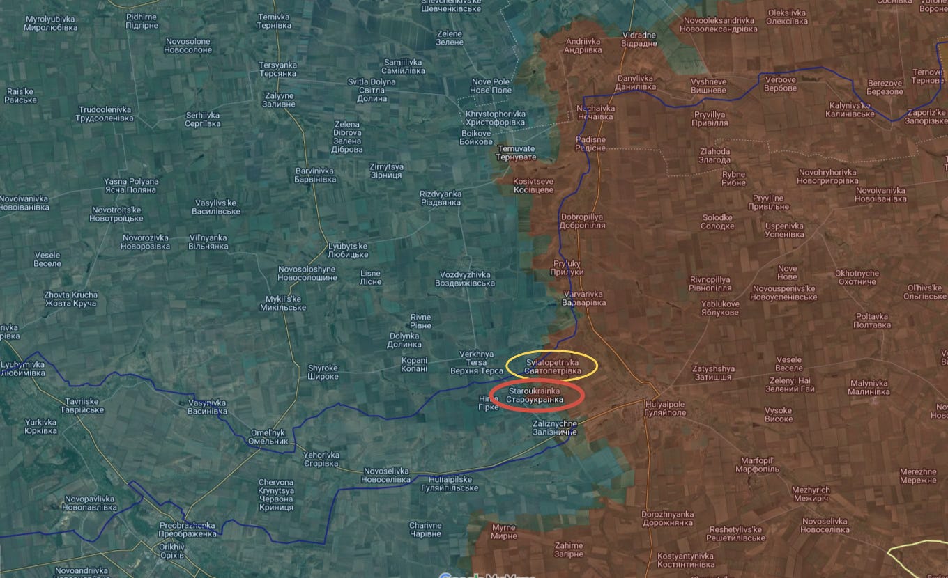 We last left off in the Zaporozhye region where the most traction has been generated of late. Last time Russia had just captured Sviatopetrovka (circled in yellow below), and now they have captured neighboring Staroukrainka (circled in red) only a couple days later—obligatory capture video from the MOD: