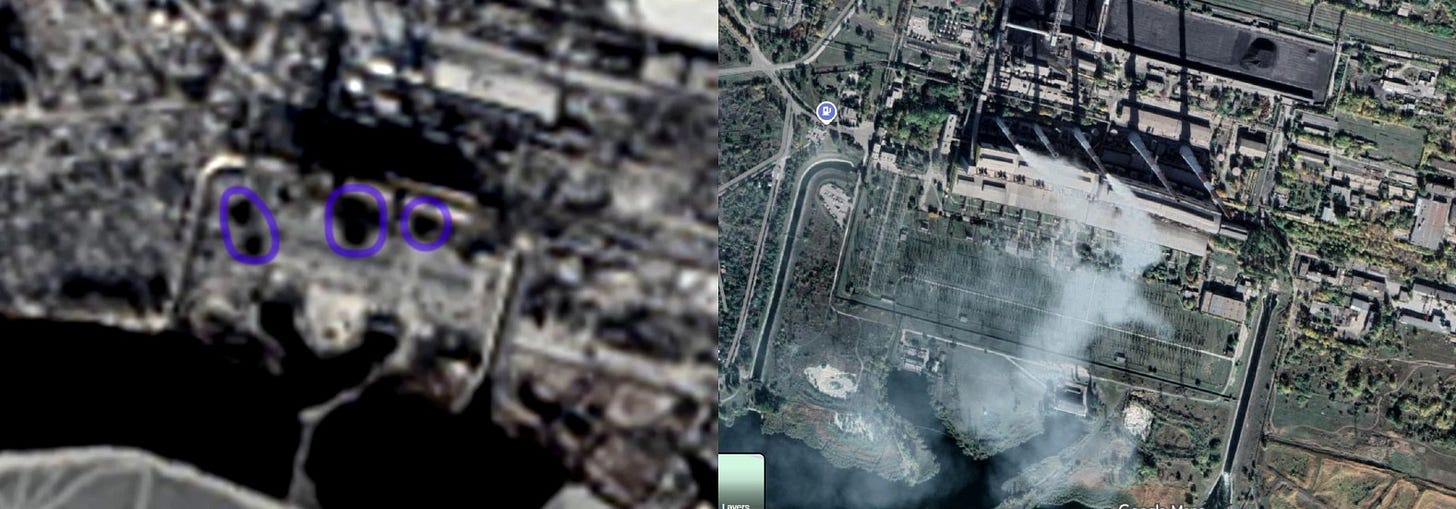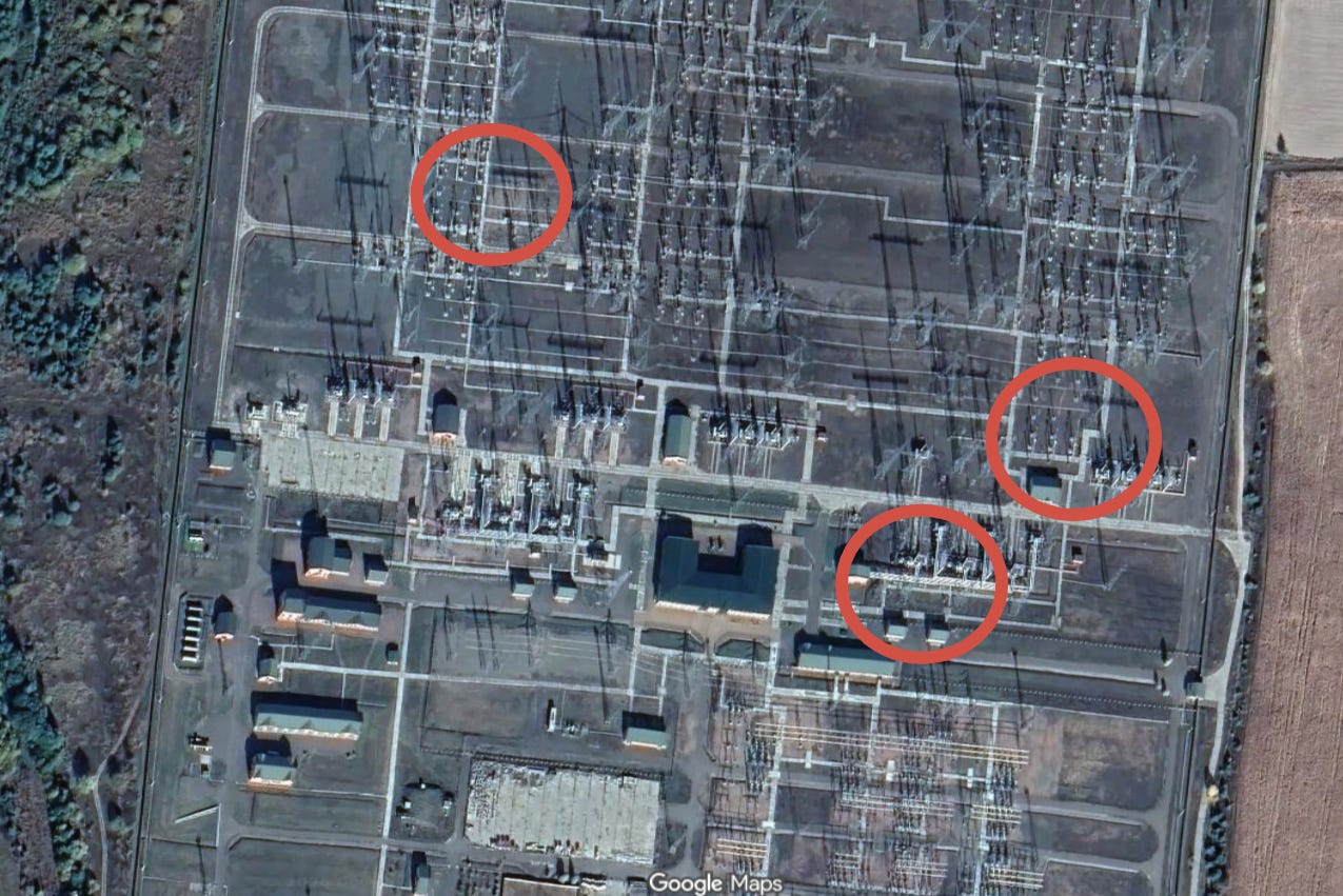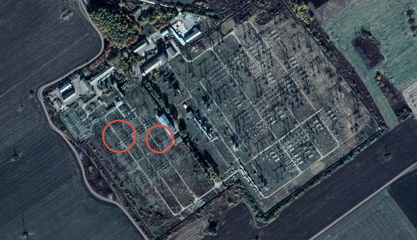 Either way, you can still see how such strikes are not ‘end-all-be-all’ and why Ukraine continues to have working power. There appears to be three successful hits inside the gigantic substation field, corresponding to roughly the circles below: