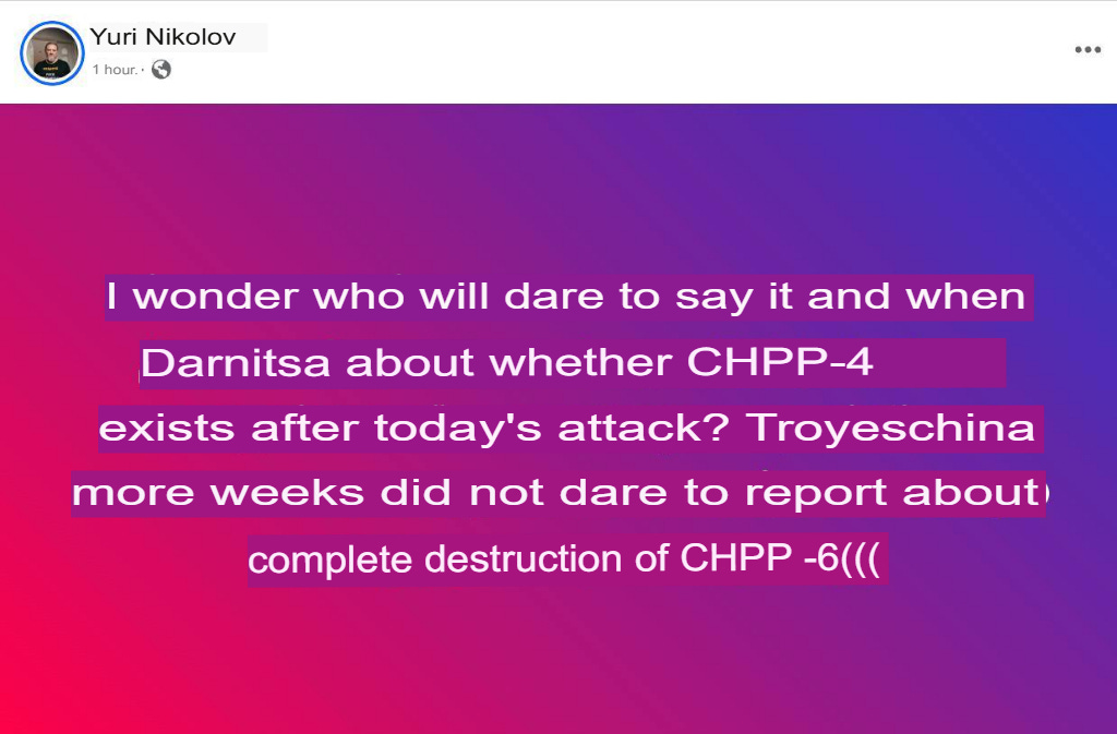 Ukrainian outlet Hromadske Radio quotes a Ukrainian infrastructure minister in writing that TPP-4 is “almost completely destroyed”: