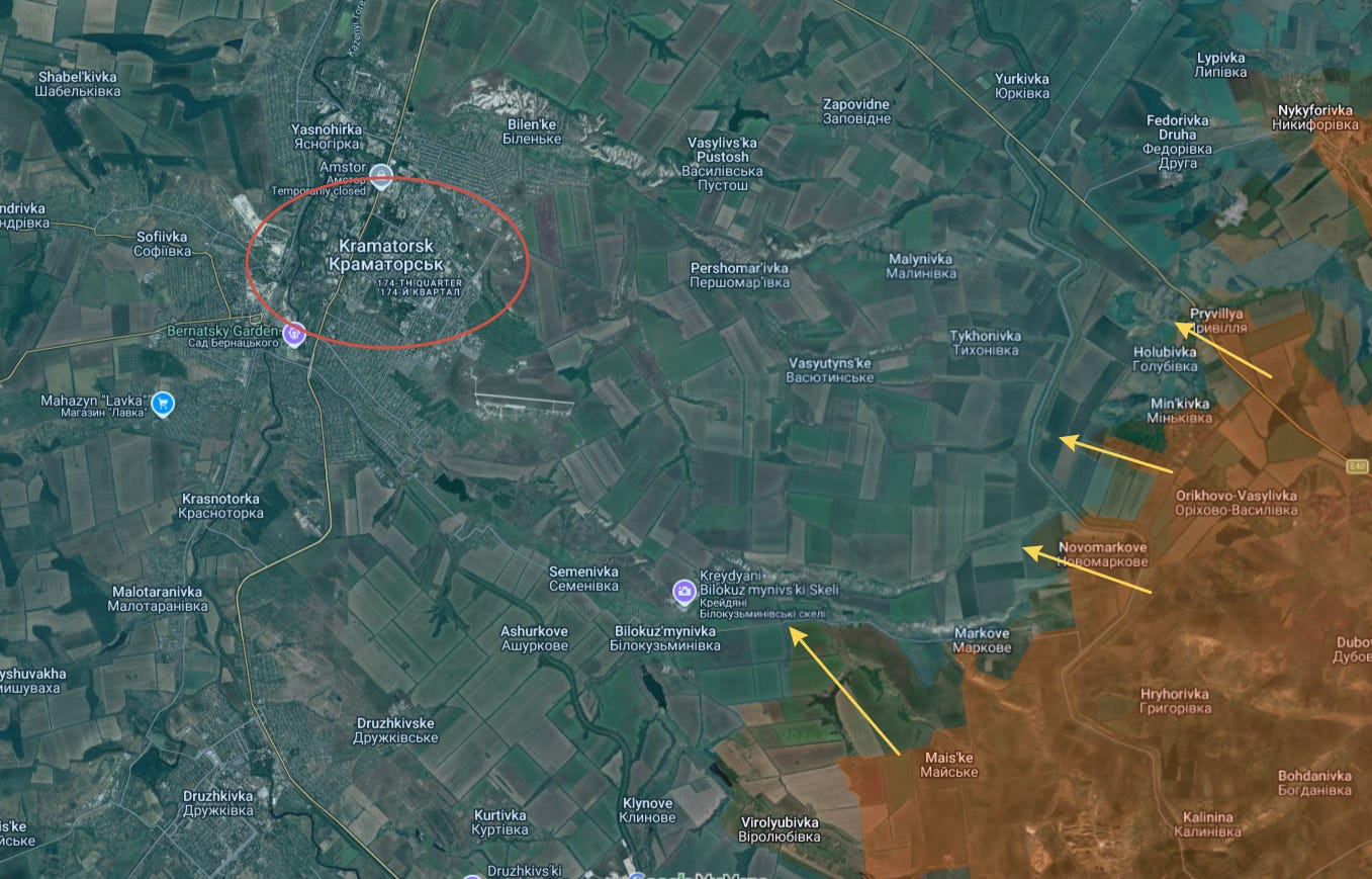 As can be seen, though the front is moving slow, there are not actually many settlements left between there and Kramatorsk—mostly open fields.