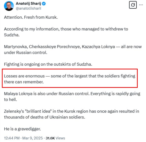 Now we wait and see what happens after Kursk falls—which could still take time if Ukraine happens to dig in to Sudzha as the last stronghold, and Zelensky decides to double down to delay the inevitable humiliation. What will be most interesting to see is whether Russia redeploys the vast amount of forces there to other hot zones on the front, or decides to continue moving forward into Sumy, where Russian forces have actually already captured a little buffer territory over the past few weeks. This could obviously become very interesting as a large, experienced force could begin bearing down on Sumy itself, putting new massive pressure on Ukraine.
