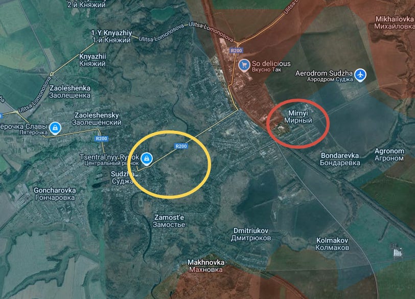 Other reports indicate that Mirnyi and surrounding area (red circle) is being cleaned up or is already fully captured, while Russian forces are already infiltrating eastern parts of Sudzha (yellow circle):