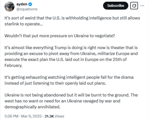 As he mentions, Ukraine is now trying to make up with Trump, with the two set for a conciliatory Saudi Arabia meeting this week. The purpose of it, from the Trump side, is to “gauge” how amenable Zelensky now is to peace—i.e. whether he’s changed his tune after being given a slap on the wrist. And a slap it was, because word has it Trump has now implied that the intelligence pause may soon be overturned:
