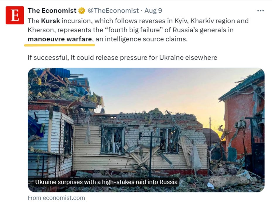 Since the start of the Ukrainian Kursk offensive on August 6th, 2024, there have been innumerable claims from the pro-Ukrainian West heralding the rebirth of “maneuver warfare”. Several high-profile figures and publications declared that offensive warfare is back on the menu, as if Ukraine had finally solved the riddle of the modern positional stalemate which has vexed both sides for nearly the past two years.