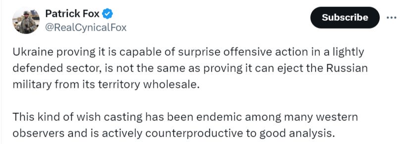 In short: Ukraine choosing a lightly guarded, strategically trivial rural border area to send a shock fist of their most elite brigades through against a bunch of unarmed conscripts is not the highpoint of “maneuver warfare”, and in no conceivable way heralds its return. Anyone can send a couple light cavalry battalions to go romping through an undefended countryside to temporary effect—but that is not at the heart of maneuver warfare’s basest definition.