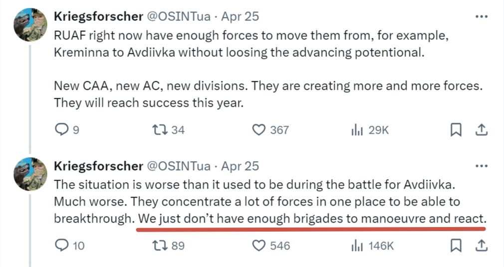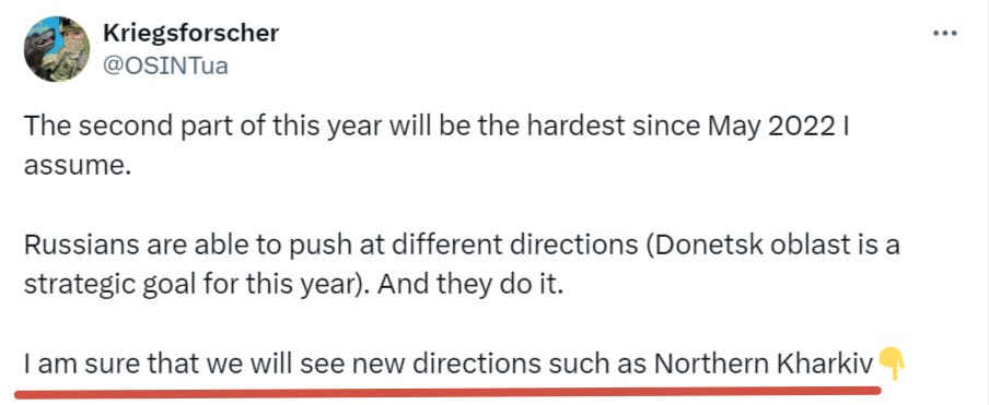 As I’ve been writing for a while now, he acknowledges that Russia may be looking to create another fixing operation in the north and then play things by ear depending on where the AFU commits its rundown reserves and forces. Should they overcommit to the potential Kharkov breach, then Russia could slam an offensive through the center front around Donetsk to create breakthroughs.