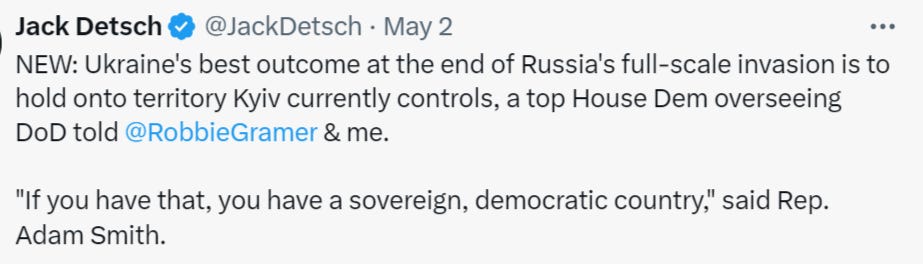 For instance Congressman Adam Smith stated the best Ukraine can hope for is to retain access to the Black Sea and not lose Kiev: