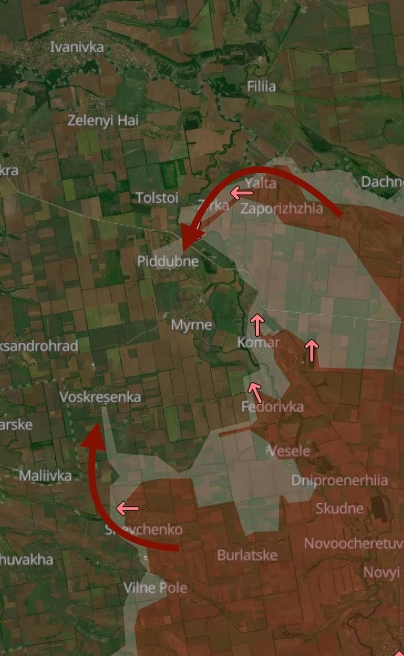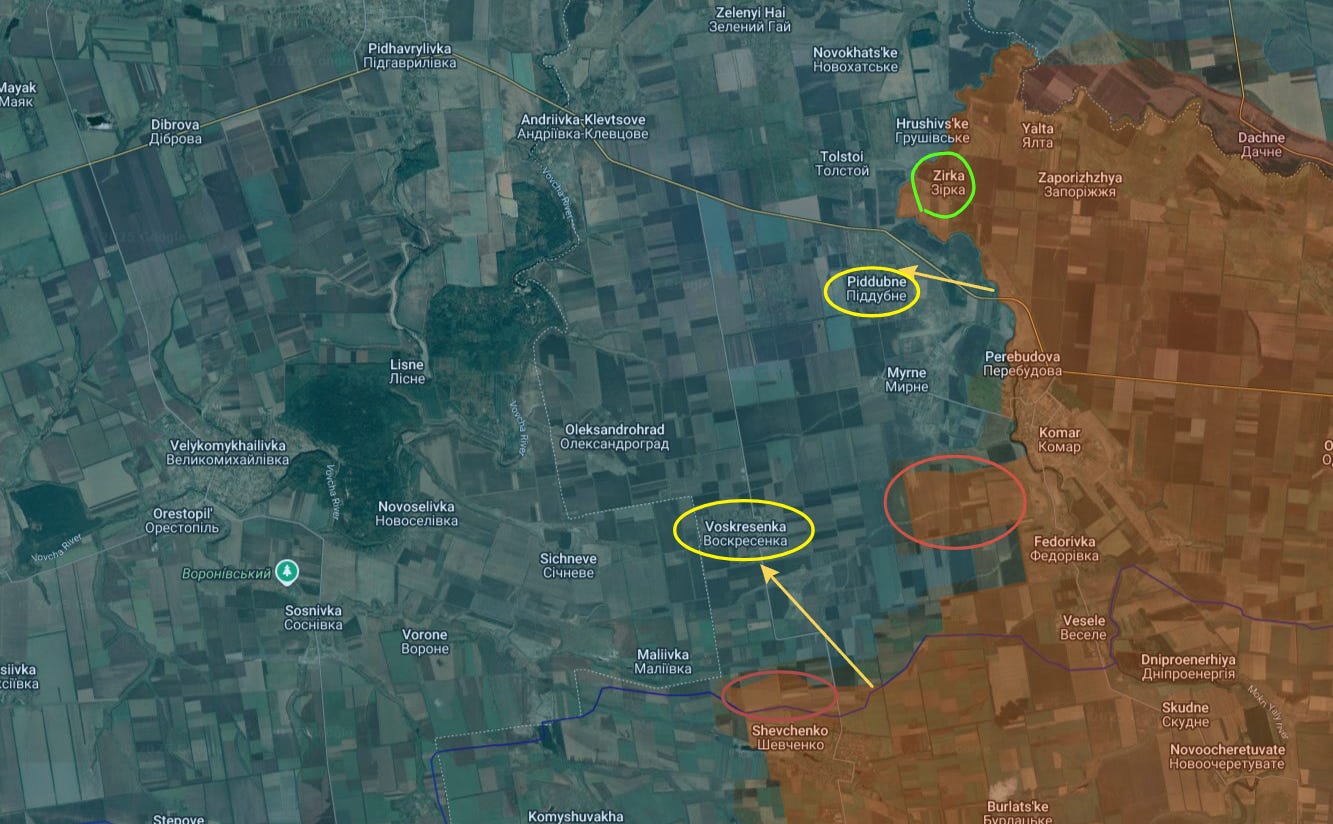 Just northeast of there they expanded territory around Komar (circled in red). Though it doesn’t show up on the maps yet, Ukrainian channels are screaming that Russian troops have already reached both Piddubne and Voskresenka:
