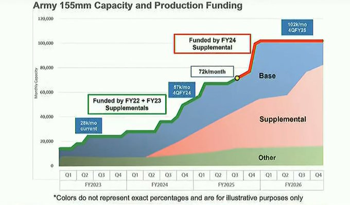 The Army recently told Congress that 155mm production currently stands at 40,000/month. This is, of course, a decrease from the 50,000/m LaPlante stated last year.