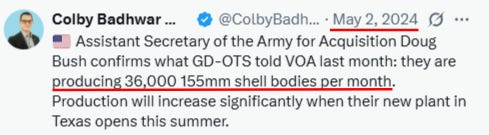 Recall it was May 2024 that the US Army production lines for the 155mm shells claimed to have finally reached 36,000 per month: